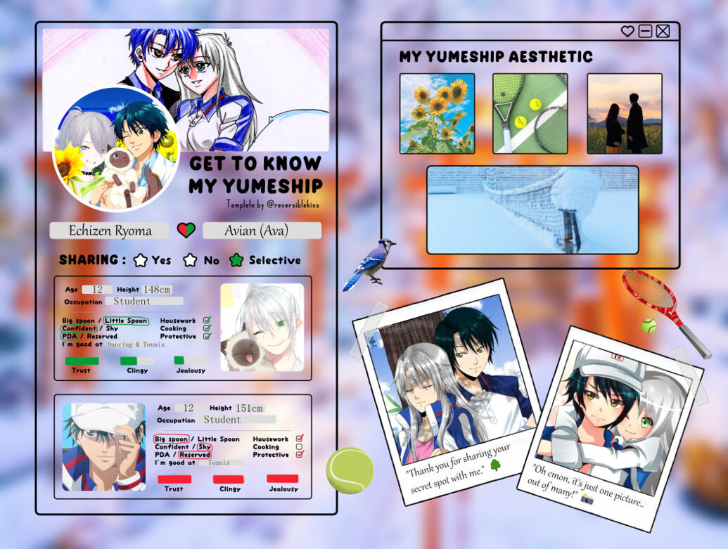 Apart from my OCs, it's not like I own the characters anyways so i don' care about sharing or not. If you are non-sharing to a chara i yume but just wish to chill together, just tell me so and i will just not speak about my yume side to you.